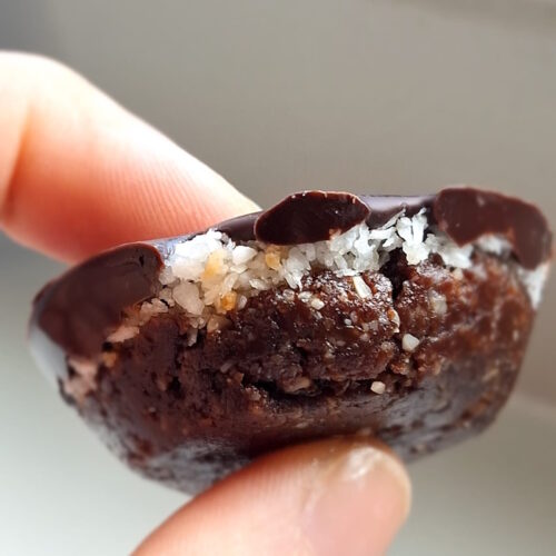 Smelt de chocola, au bain marie (met het stalen kommetje in een pannetje met een laagje heet water), en verdeel over de dadel-kokos rondjes in de siliconenmal.
